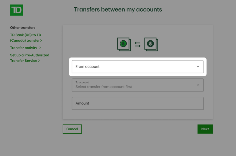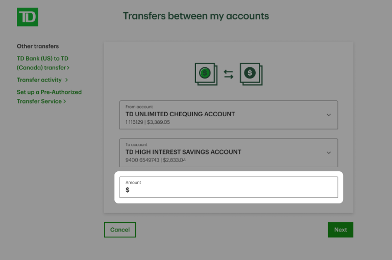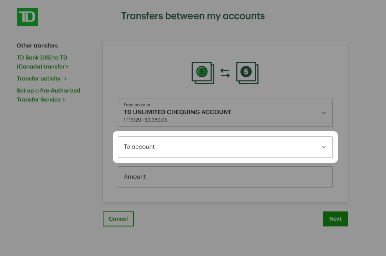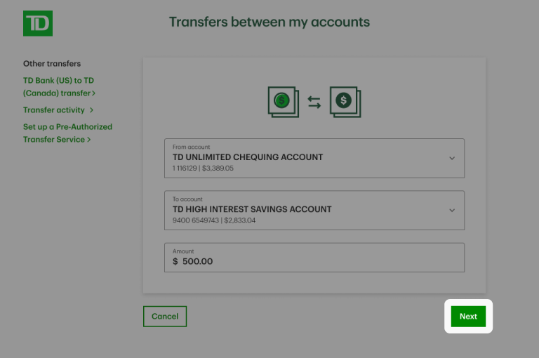 Learn how to transfer money between your Canadian TD accounts (including credit cards).
