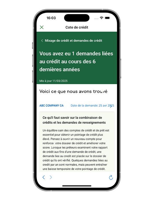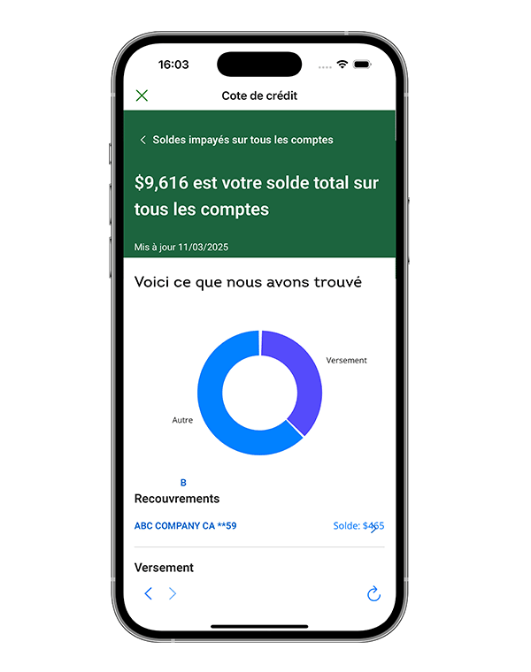 Gardez votre cote et vos antécédents de crédit à l’œil, recevez des alertes de fraude et voyez les conséquences possibles de mesures financières sur votre cote, le tout sans incidence sur votre cote de crédit.