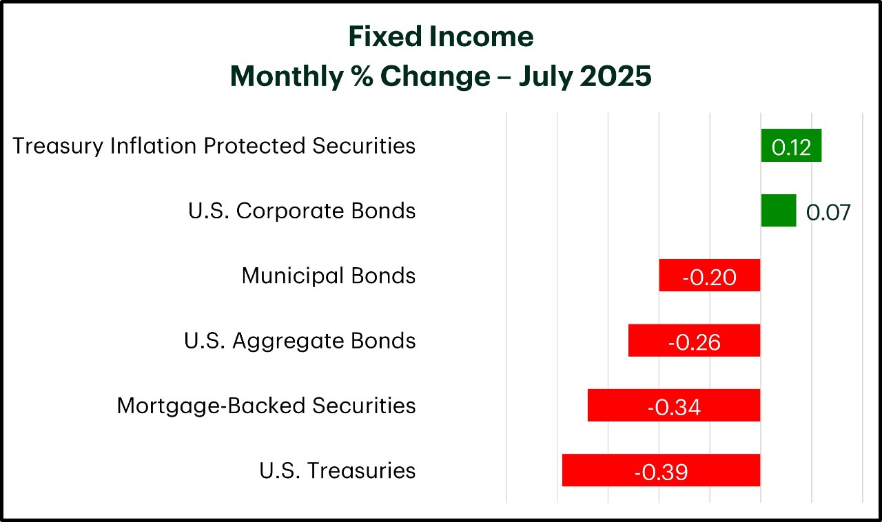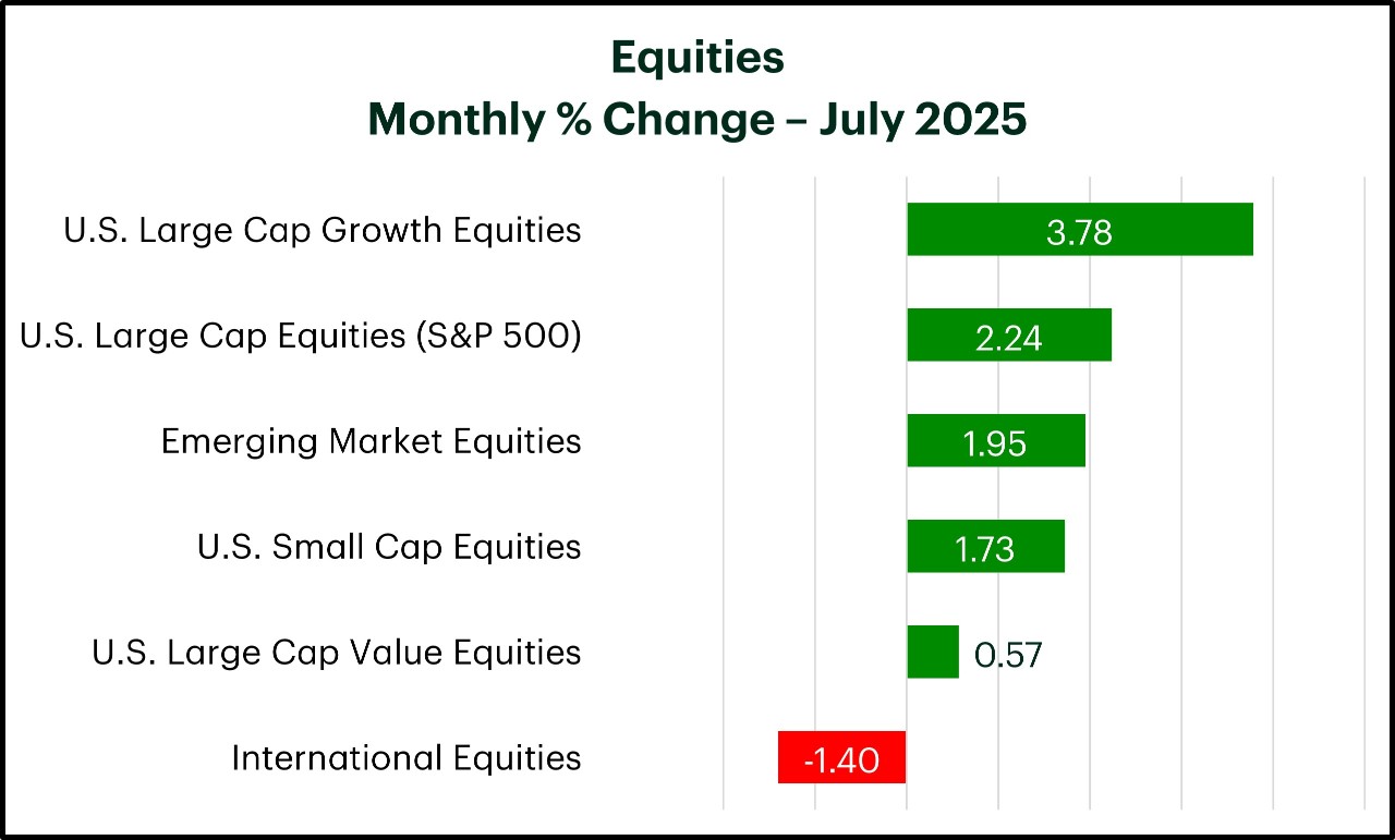 Market Momentum: Equities continued to advance in July with the S&P 500 Index of U.S. companies notching its third consecutive monthly gain and setting a fresh all-time high along the way. Technology emerged as a key driver of performance as earnings growth and the prospect of advances in Artificial Intelligence helped to fuel investor optimism. While major domestic stock markets were positive, international developed equities gave back some of their strong year-to-date gains in U.S.-dollar terms, as the value of the dollar rebounded. Despite lofty market valuations and pockets of near-term uncertainty, we believe maintaining a diversified portfolio with exposure to a wide range of asset classes, sectors and geographical regions can provide investors with the opportunity to benefit from multiple drivers of return over time.